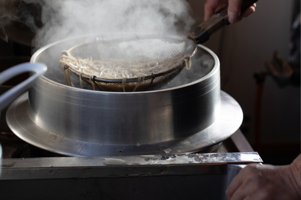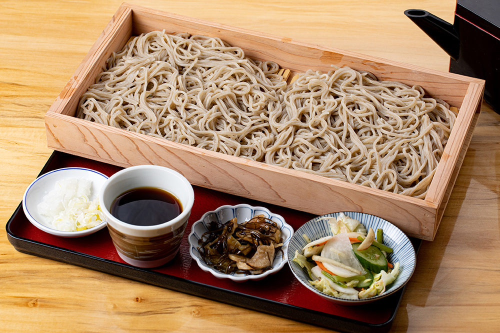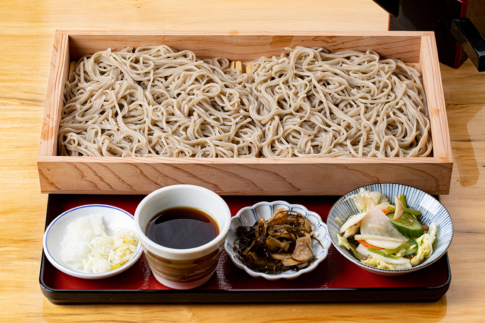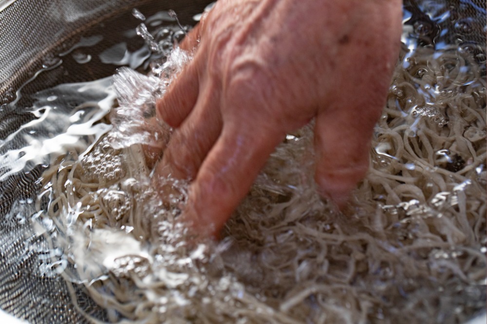 そばの実からそば粉にする自家製粉の作業を行い、手打ちの十割そばを提供します。